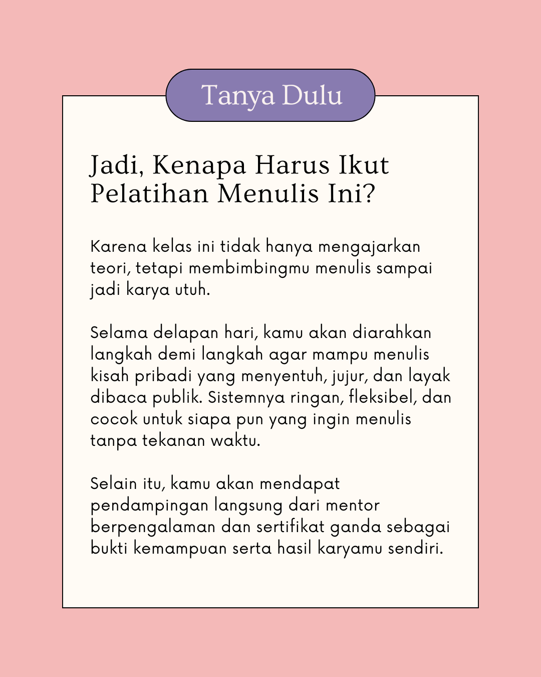 Kelas ini berbasis 30% teori dan 70% praktik, dengan pendampingan langsung dari mentor untuk memastikan setiap peserta benar-benar menulis sampai selesai.